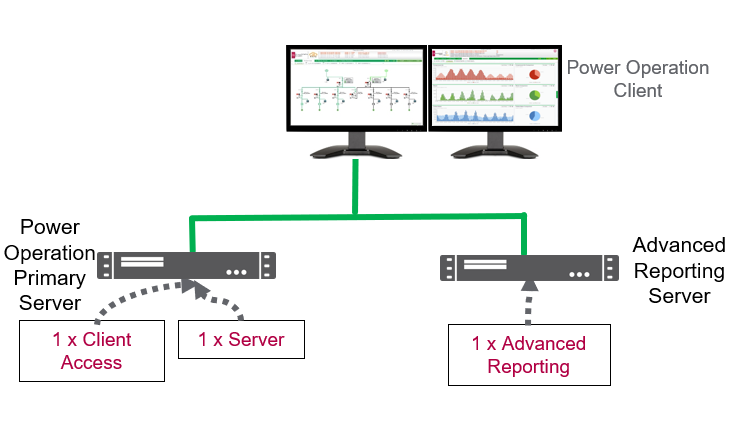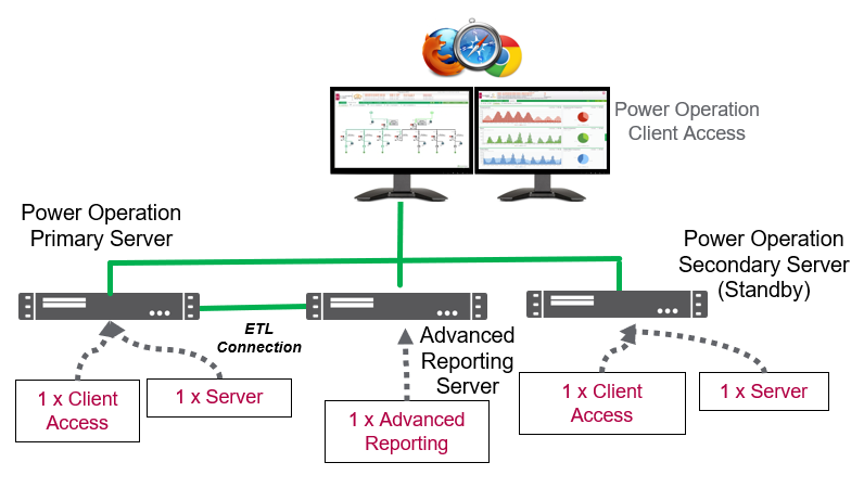 The Power Operation Server and Advanced Reporting Module are installed on the same machine. Additionally at least one additional Client Access license is required to enable remote web client access if hosted on the Primary Server machine.