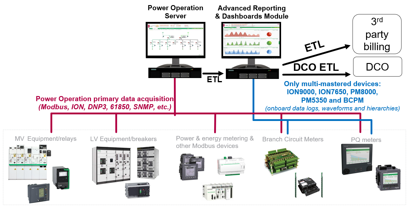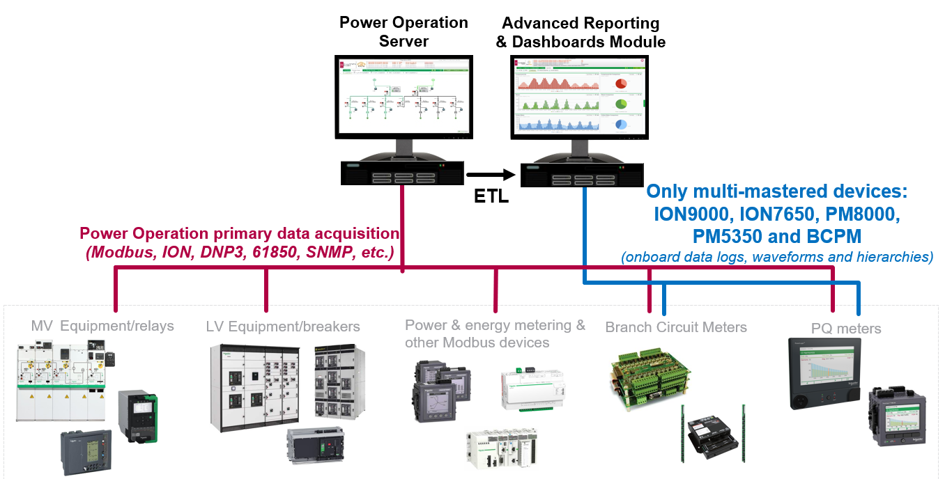 - Single-mastering all devices – Setting up device communications with Power Operation and then transferring device data to Power Monitoring Expert using an Extract, Transform, and Load (ETL) tool