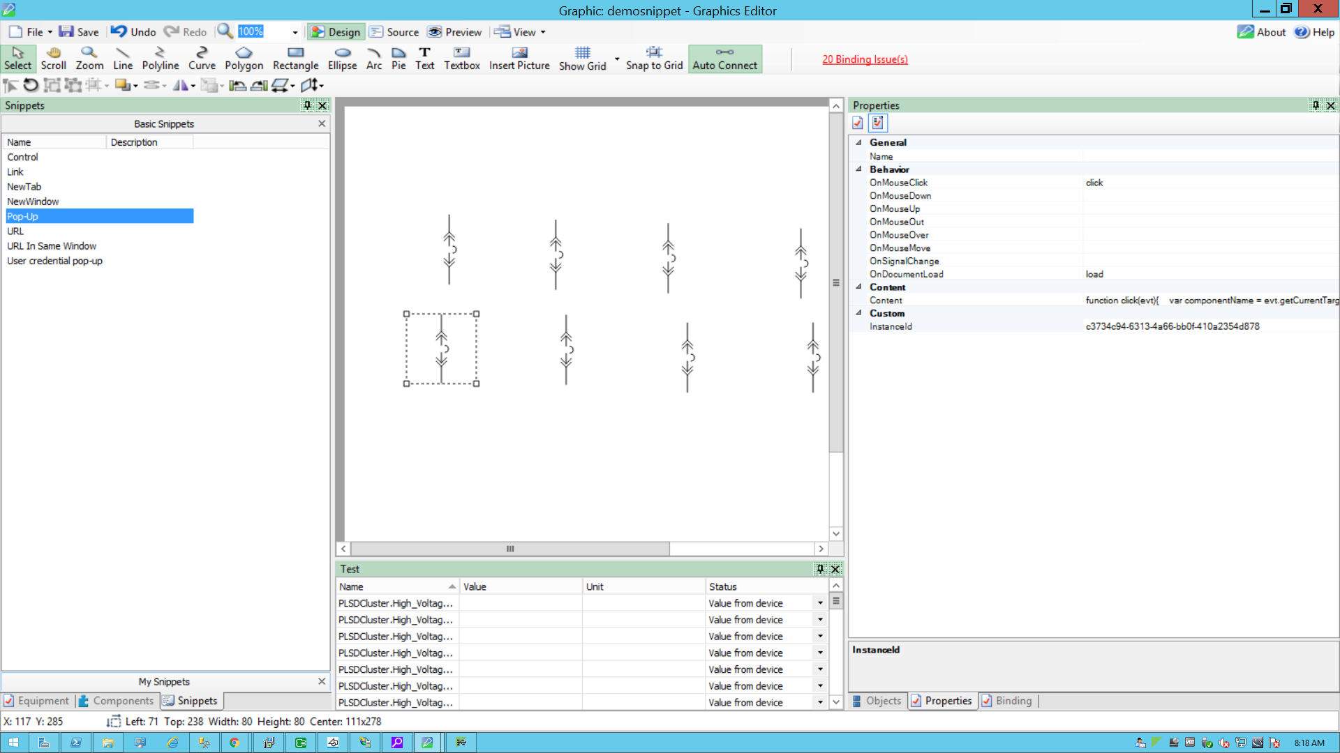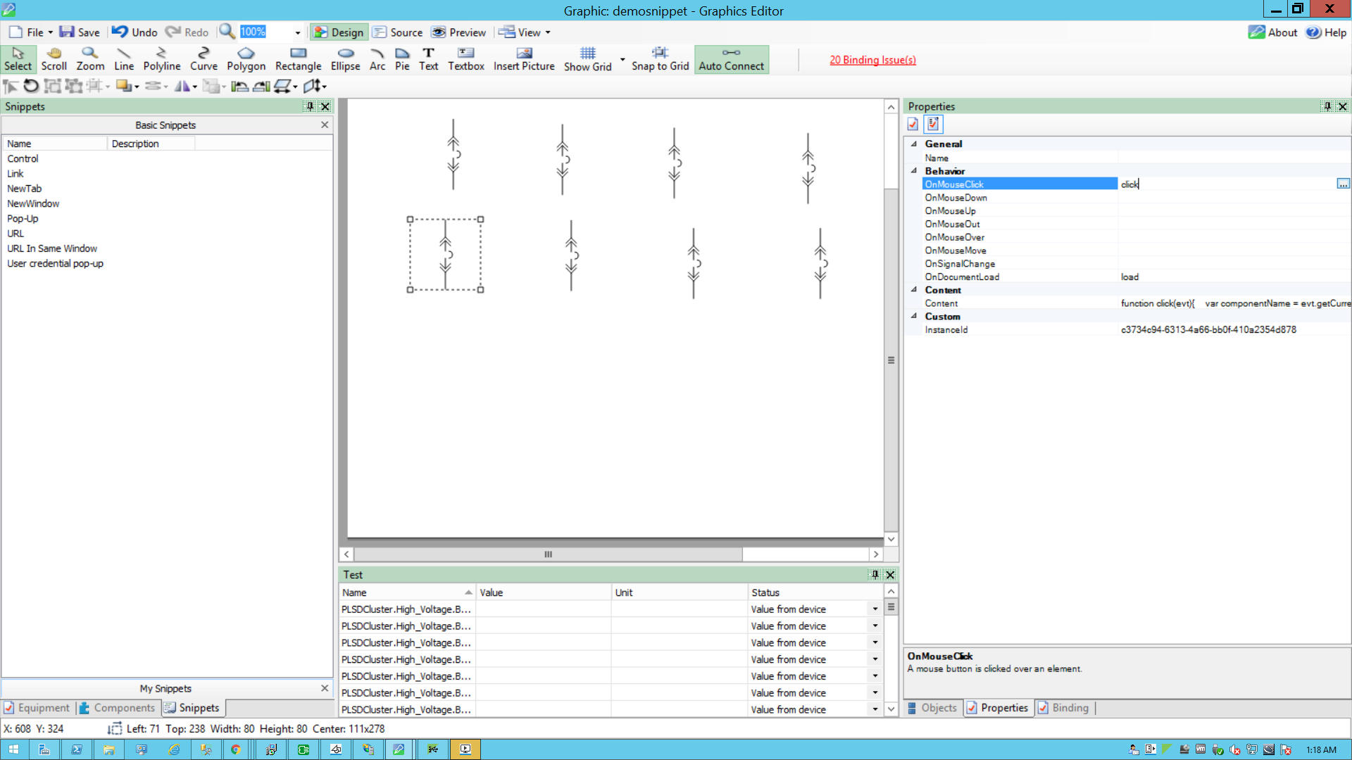 This example uses a graphic file that already has a binded component or equipment in the workspace. For more information on how to prepare the TGML graphic snippet examples, see TGML snippet example prerequisites.