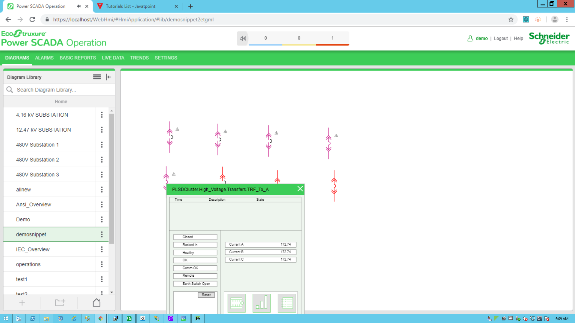 - Click the breaker to open a pop-up displaying real time readings from the component.