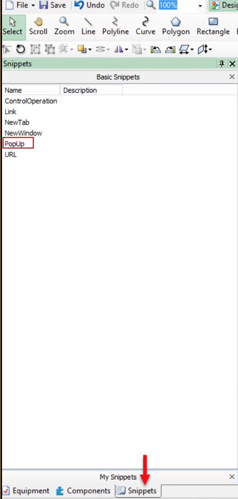 - In the Snippets pane, click PopUp.