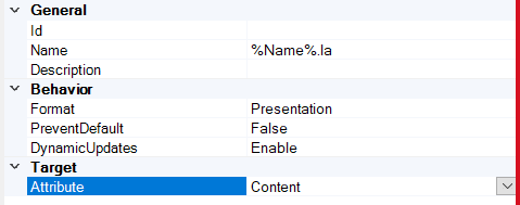 In the bind properties, the Presentation values are Format = Presentation, Attribute = Content: