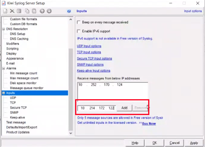 - Enter the retrieved IP address in the Kiwi Syslog Server setup > Input.