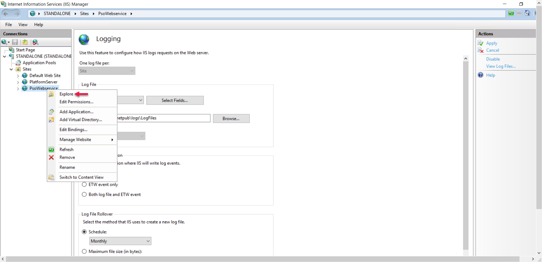 - In the Connections pane, right-click the PSOWebService folder > Explore.