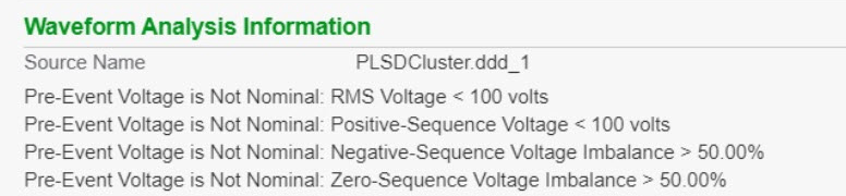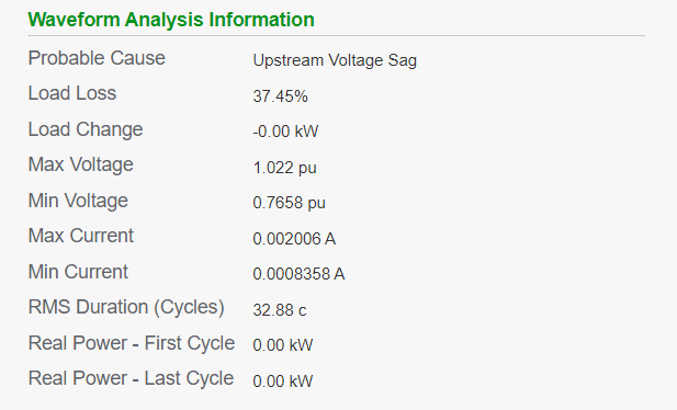 The Waveform Analysis Information section will provide data and information to help determine the cause of the event. Events may be caused by: