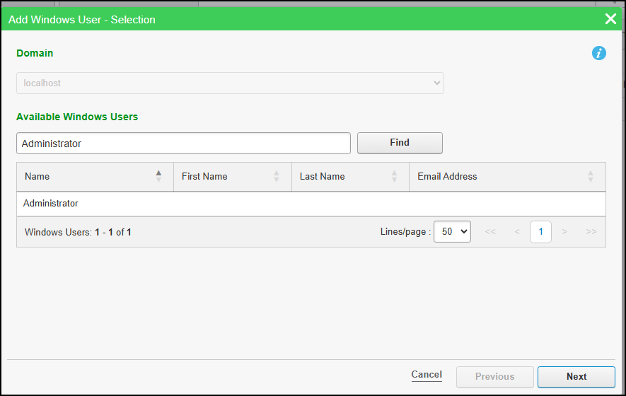 - In the search result table, select the Windows user you want to add, and then click Next.