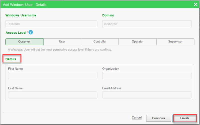 - In Add Windows User - Details, assign an access level, and then click Finish.