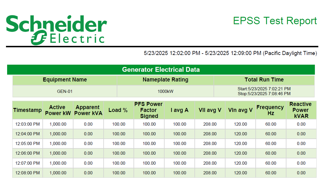 The Generator Test EPSS Report shows load measurements and the sequence of events for generator test runs. You can configure it to meet the requirements of an Emergency Power Supply System (EPSS) test, including Automatic Transfer Switches (ATS). Use this report to assess the performance of your backup generation systems during test runs. You can also use this report to evaluate pass/fail criteria for EPSS testing.