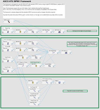 The EPSS ASCO ATS 39PM1 Framework template includes 5 digital input modules and 2 data log modules to monitor and record the engine start signal, ATS in test, emergency source acceptability, ATS normal position, and ATS emergency position signals. These signals are all pre-wired to PM8000 I/O on ASCO ATS with switch accessory 39PM1. This framework is compatible with Open Transition (OTTS), Closed Transition (CTTS), and Delayed Transition (DTTS) ASCO transfer switches, and it does not require additional configuration based on ATS type.