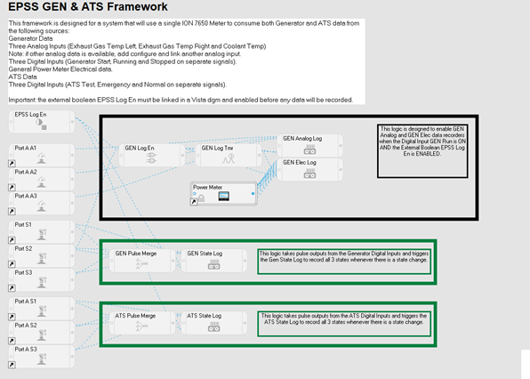 Paste this framework into a compatible ION device and complete its configuration using the information provided in the framework and in Configure Generator Test EPSS. Extend the framework as needed to add additional, optional inputs such as ATS power outage, the emergency power source available signal, or engine oil pressure measurements.