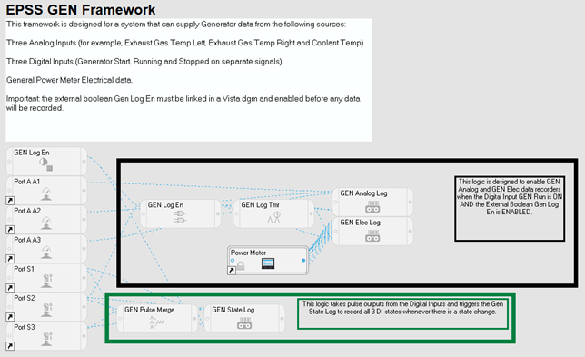 The EPSS GEN framework template includes 3 digital input modules, 3 analog input modules, and 3 data log modules to monitor and record: