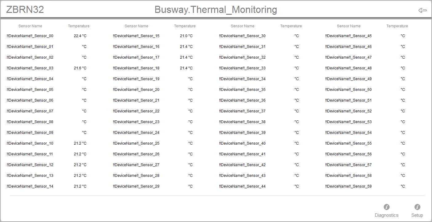 The diagram shows information for 60 possible temperature sensors. Only those sensors that are installed and connected to the ZBRN32 access point show a temperature measurement.
