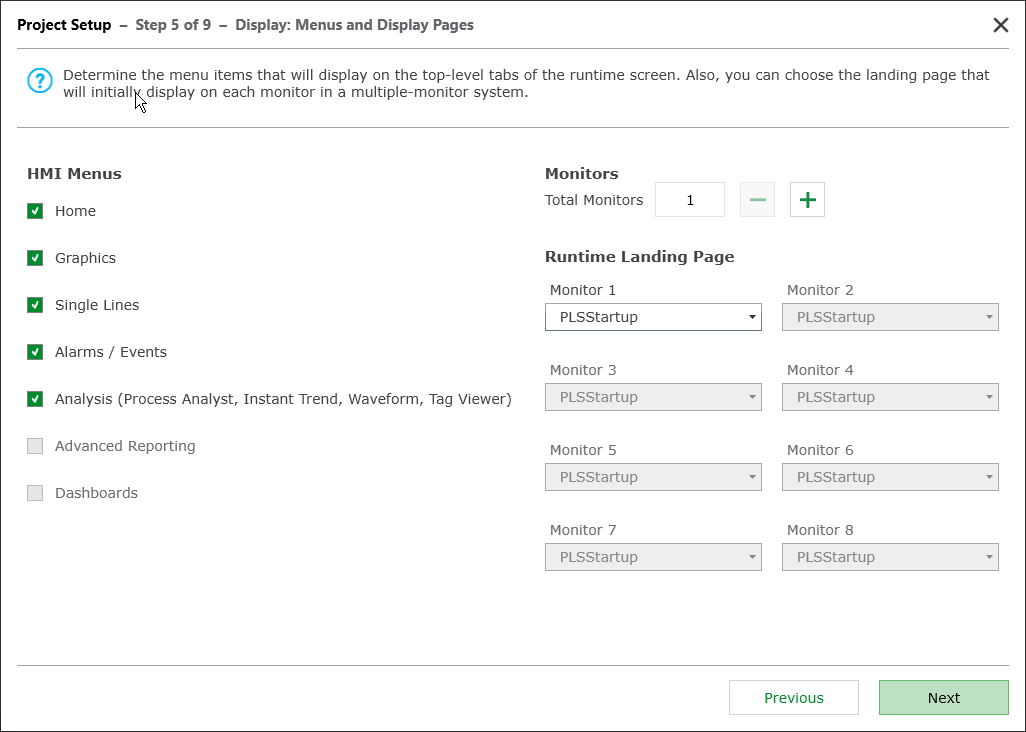Use Menus and Display Pages to add top-level menus that display in the runtime human-machine interface (HMI). The HMI is the view that users see. You can also define the default runtime page that will display on a monitor.