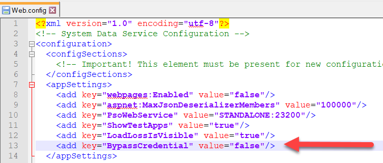 configuration > appSettingssection, edit the value for BypassCredential totrue. If the Web.config file does not have this property, you can enter it manually. In theconfiguration > appSettingssection, enter<add key="BypassCredential" value="true"/>. - Save the file and restart IIS.