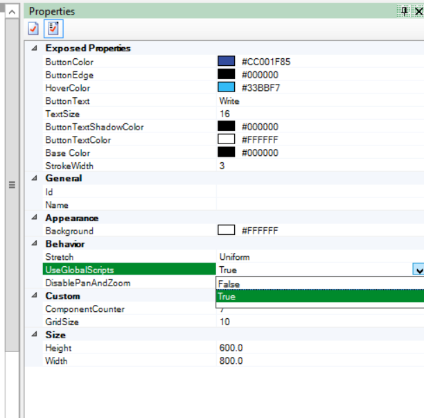 - Go to Properties pane again, and from the UseGlobalScripts attribute drop-down select