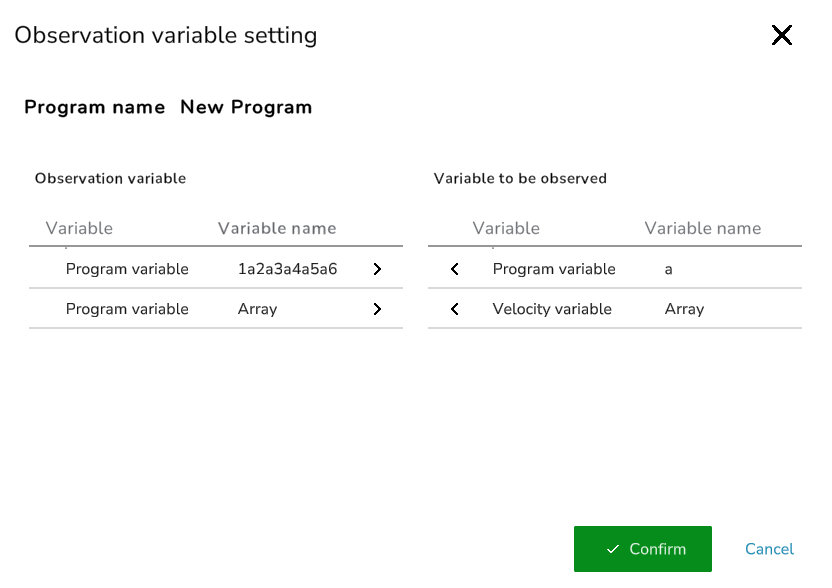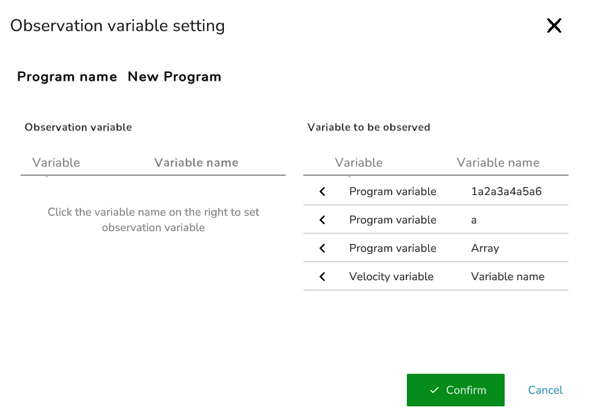 In the Variable to be observed table, click on the variables you want to monitor. Result: The selected variables are displayed in the Observation variable table.