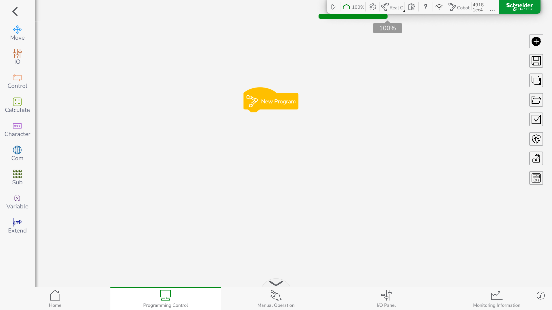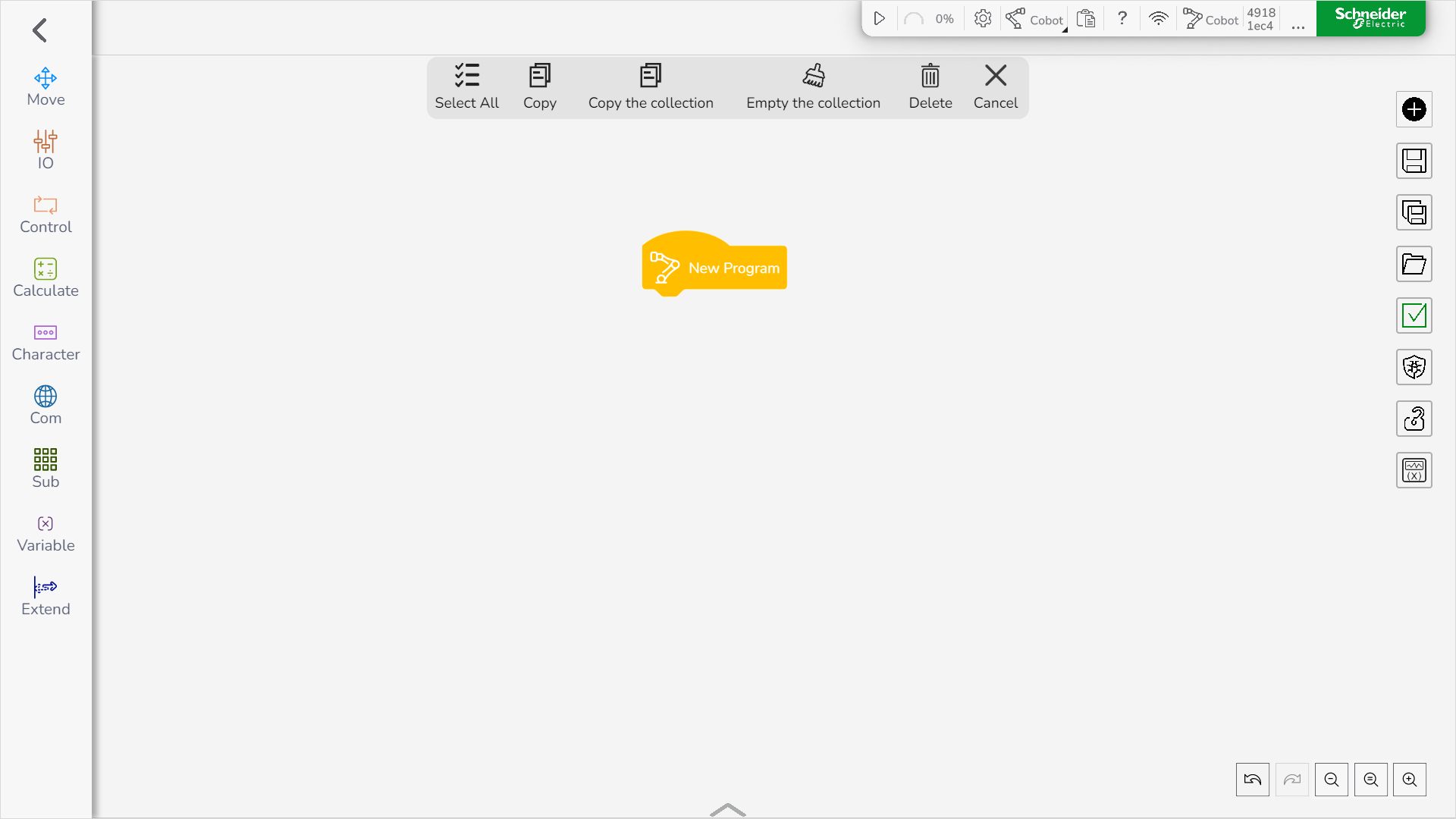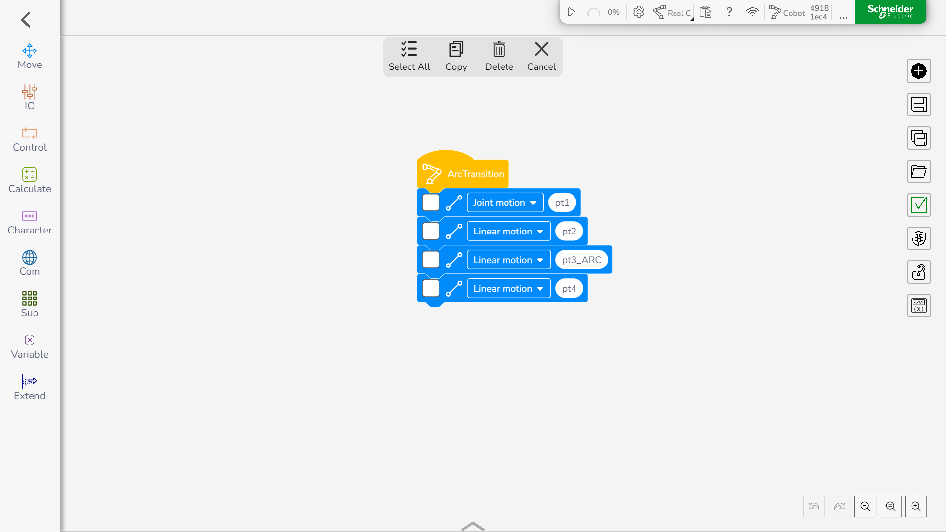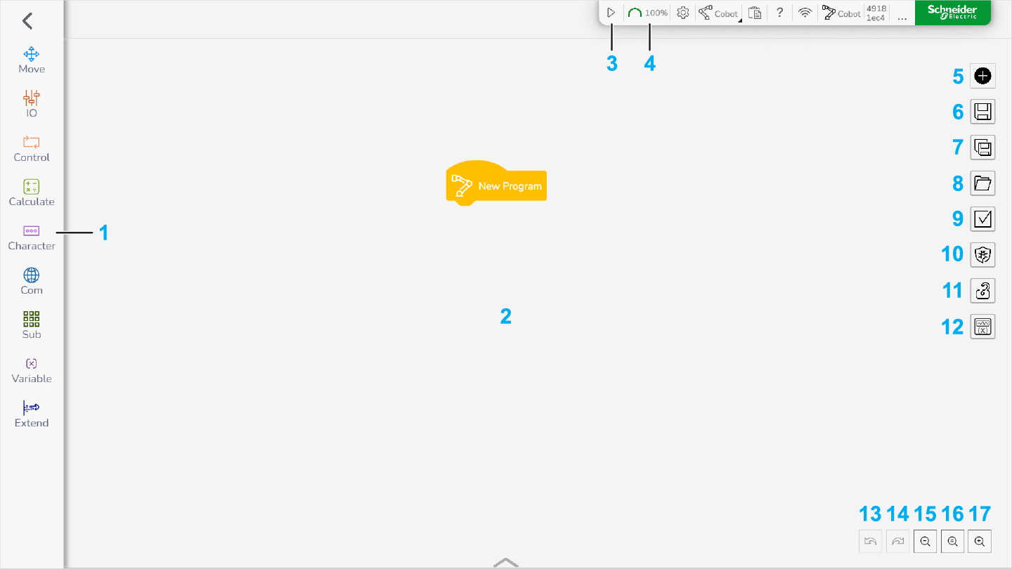 EcoStruxure Cobot Expert provides a visual programming interface which contains programming blocks and assisting dialog boxes to develop the program code for the Lexium Cobot.