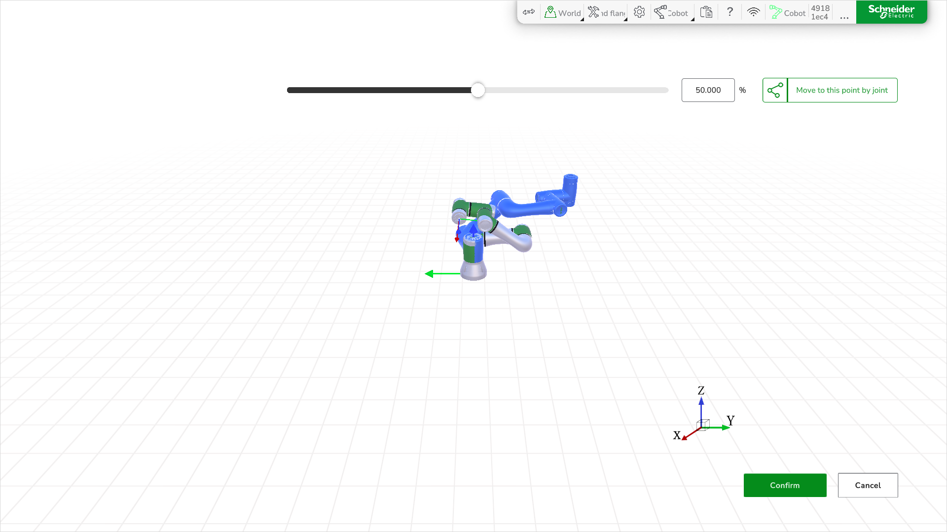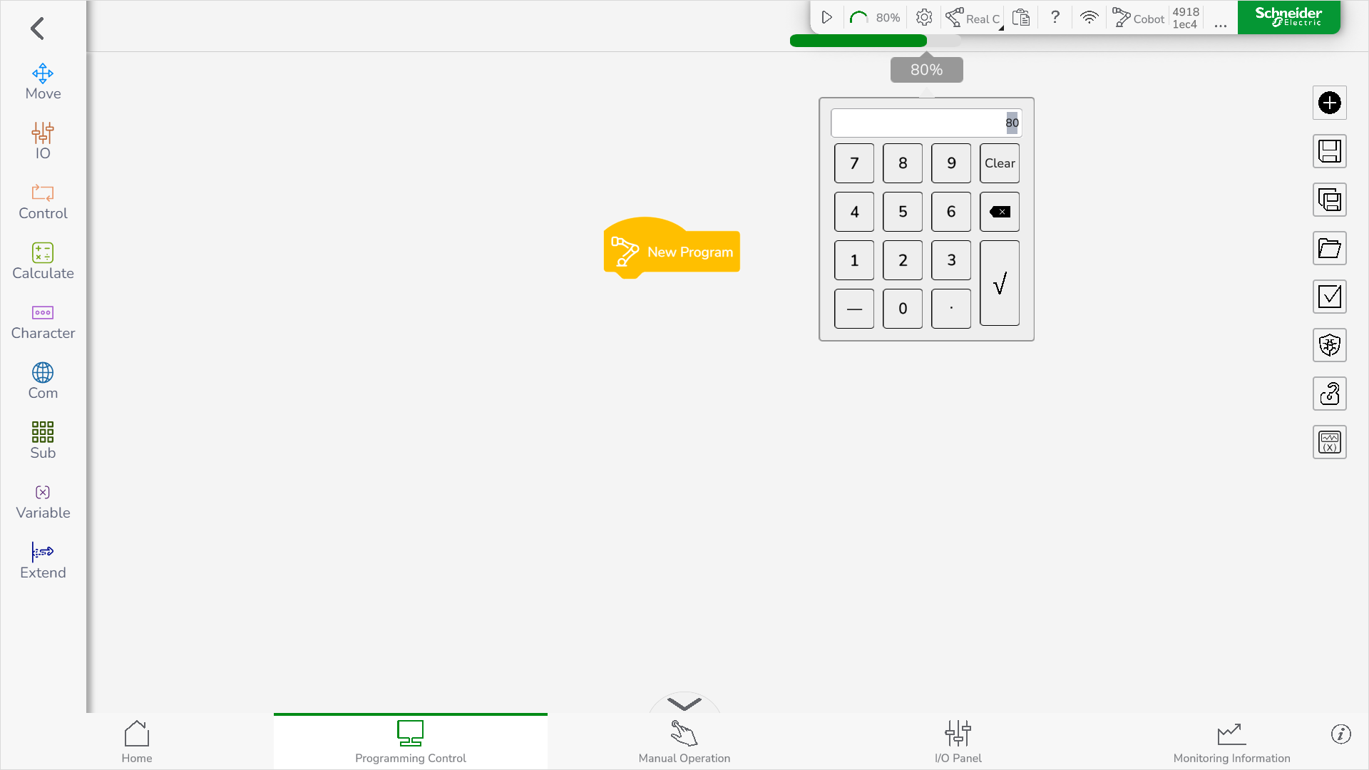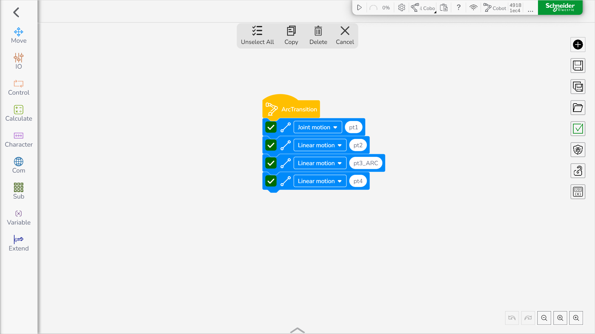 EcoStruxure Cobot Expert provides a visual programming interface which contains programming blocks and assisting dialog boxes to develop the program code for the Lexium Cobot.