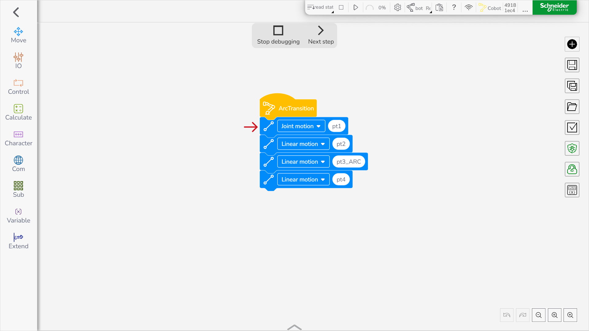 Click Single-Step Debugging. Result: The Lexium Cobot starts to run the program. The red arrow on the left side of the instruction indicates the next instruction to be executed. During the single-step debugging operation, the illuminated ring of the Lexium Cobot Arm flashes yellow at the hardware and at the representation in the Home screen of the software.