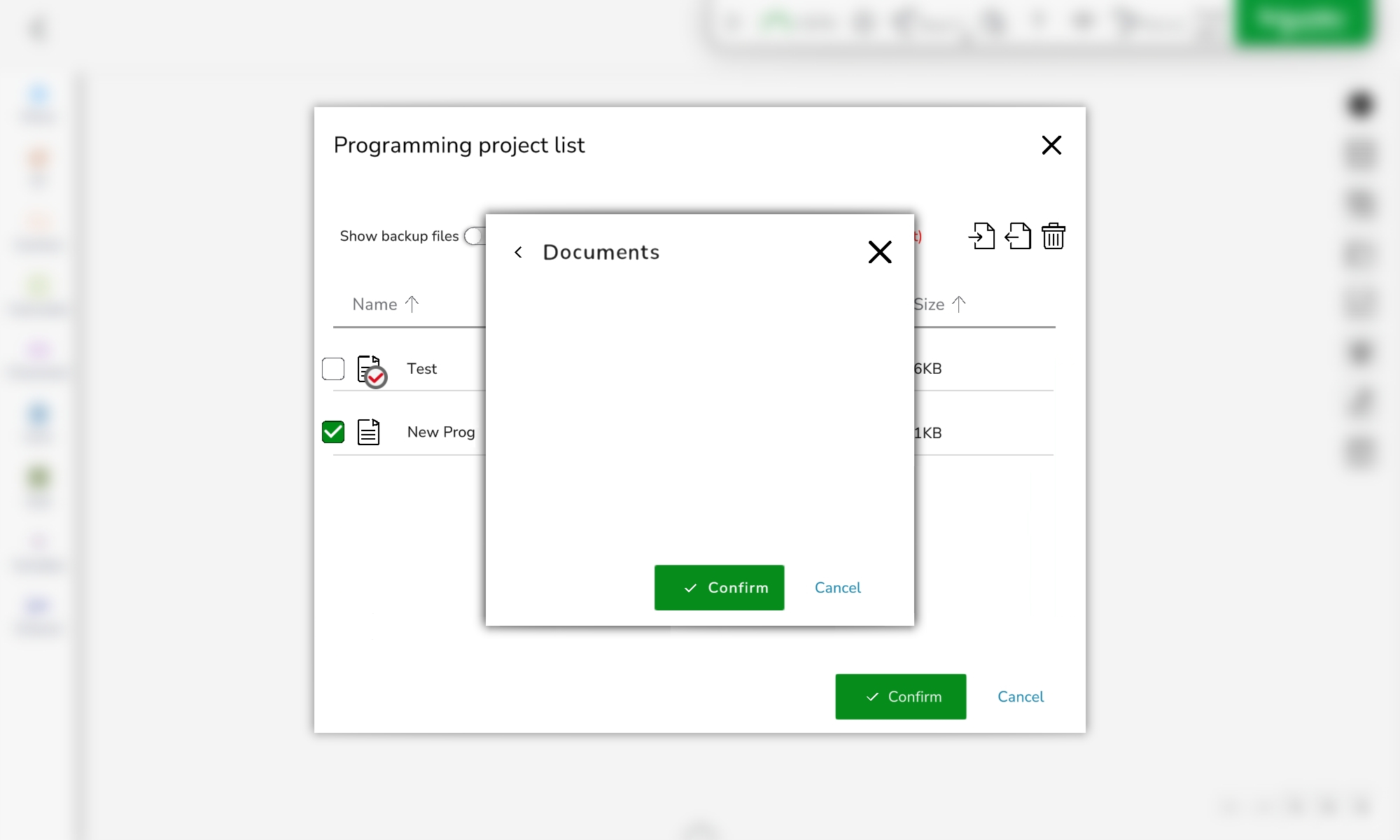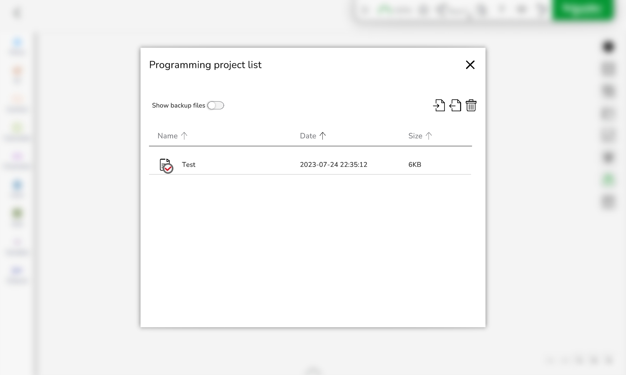 In the feature bar, select Programming Control. Then, click the Open icon on the right of the editing area. Result: The programs saved in the Lexium Cobot Controller are displayed.