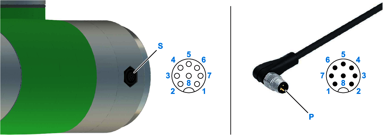 The following figure presents the socket-type M8 connector (S) at the Lexium Cobot Arm flange and the delivered extension cable equipped with an 8-pole M8 plug-type connector (P) with a length of 400 mm (15.7 in) and open ended (reference LXMRL00YY011).