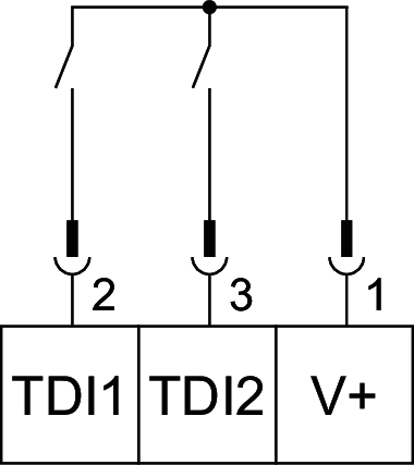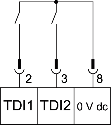 The following figure presents the sink wiring of the controller digital inputs. Sink or source can be configured on the digital input settings by the application.