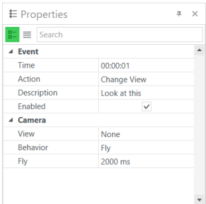 With the change view action you can get EcoStruxure Machine Expert Twin to change the viewing angle on the model when the event occurs. In the ‘view’ box you can choose any camera view you have preset (click here to see how). You can also set if you want the action to fly to the new camera view or jump to it. If you choose fly, you can set how fast flies.