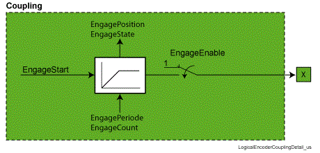 To achieve engaging and disengaging without jerks, the speed modify is controlled trough EngagePeriode and EngageCount. In the EngagePosition and EngageState parameters, the actual values of the coupling are depicted.