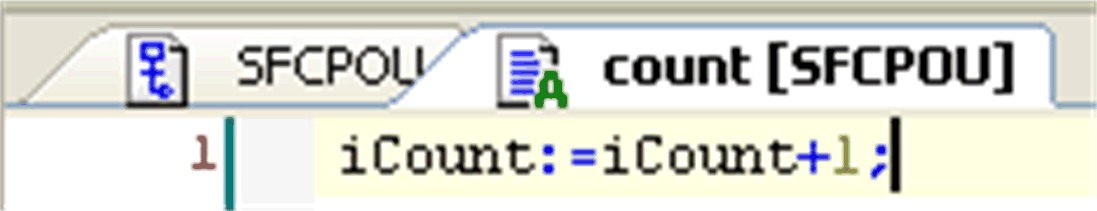 La acción Action_AS1 está asociada con el paso AS1 como acción de paso (izquierda), o como acción IEC con el descriptor N (derecha). Debido al hecho de que en ambos casos se utilizan 2 transiciones, se deberán realizar 2 ciclos del controlador para cada una antes de que se vuelva a llegar al paso inicial, suponiendo que una variable iCounter se incremente en Action_AS1. Tras una reactivación del paso Init, iCounter en el ejemplo de la izquierda tendrá el valor 1. En la derecha, no obstante, tendrá el valor 2 porque la acción IEC, debido a la desactivación de AS1, se ha ejecutado dos veces.