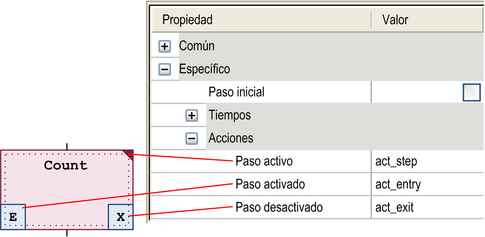 La acción se asocia a un paso por medio de una entrada en el campo Paso activado de las propiedades de paso. |