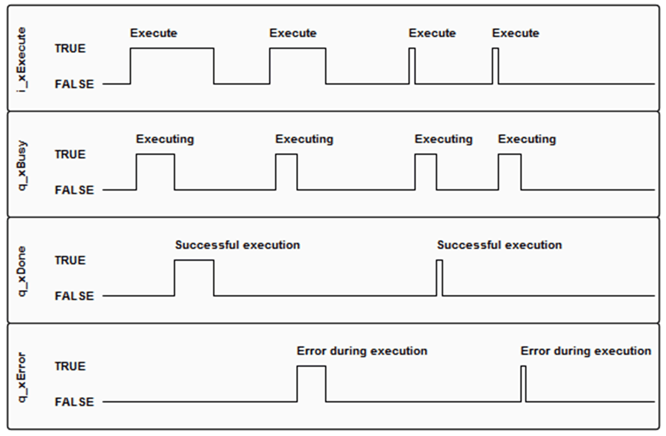 Una vez finalizada la ejecución, las salidas q_xDone o q_xError siguen siendo TRUE hasta que la entrada i_xExecute se establezca en FALSE. Si la entrada se restablece antes de que finalice la ejecución, las salidas q_xDone o q_xError se establecen en TRUE para un ciclo.