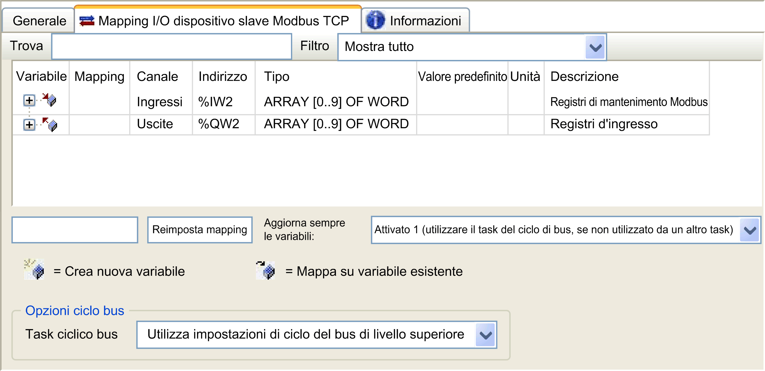 NOTA: È presente un parametro Task ciclo bus corrispondente nell'editor mapping degli I/O del dispositivo che contiene il Dispositivo slave Modbus TCP. Questo parametro definisce il task responsabile dell'aggiornamento dei registri %IW e %QW.