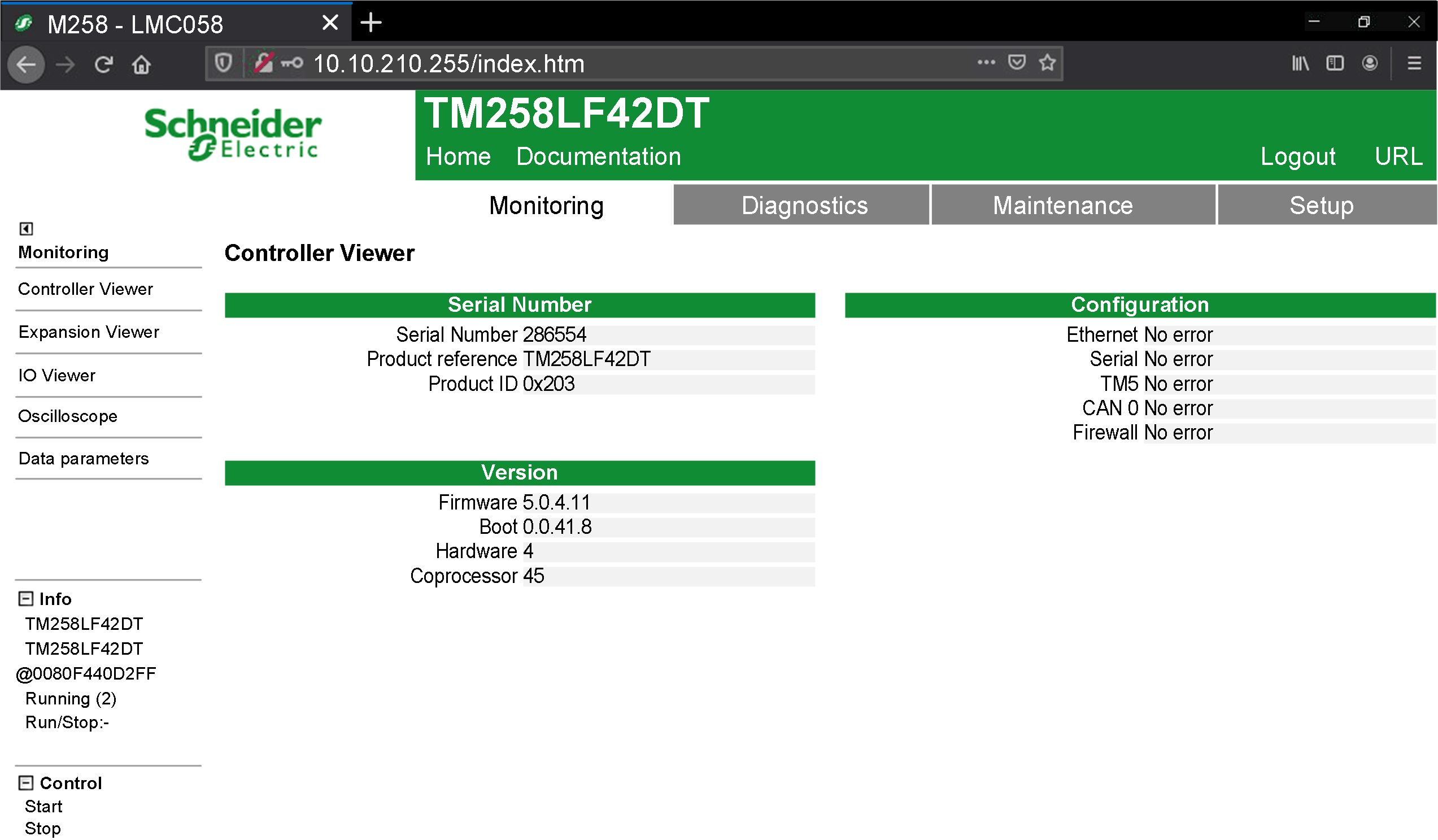 Home page of the controller Web server page. Provides access to the tabs: oMonitoring oDiagnostics oMaintenance oSetup |