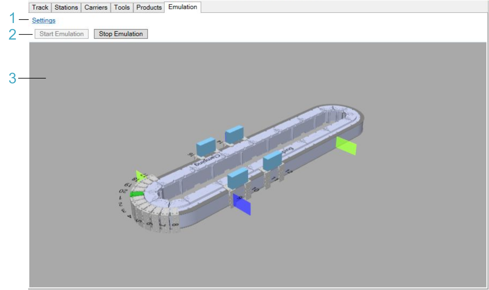 Öffnen Sie die Registerkarte mit der Emulationsansicht, um eine 3D-Emulation Ihres konfigurierten Objekts anzuzeigen und die virtuelle Ausführung des Objekts zu visualisieren.