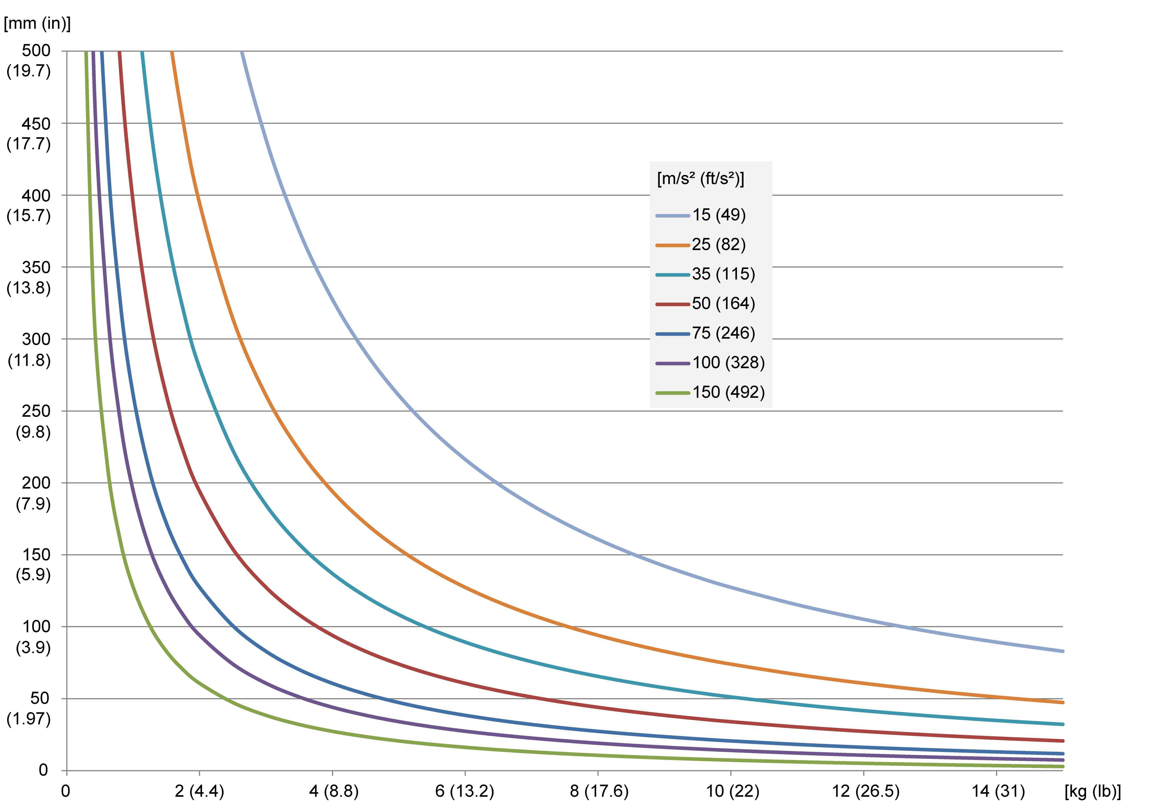 Tilting torque [Nm (lbf-in)] = payload [kg (lb)] x maximum acceleration [m/s2 (ft/s2)] x (vertical distance from the FCP [m (in)] + 0.006 m (0.236 in))