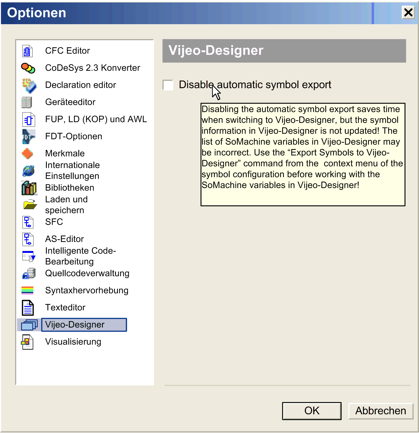 Das Dialogfeld ermöglicht die Unterbindung des automatischen Exports von EcoStruxure Machine Expert Variablen nach Vijeo-Designer.