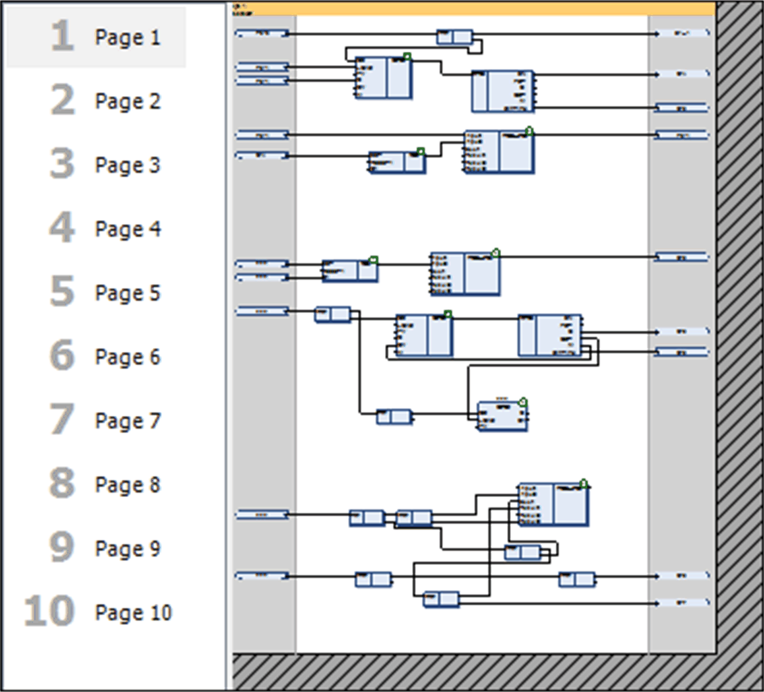 Zusätzlich zum CFC-Standardeditor bietet EcoStruxure Machine Expert einen seitenorientierten CFC-Editor. Neben den Tools und Befehlen des CFC-Standardeditors bietet dieser Editor die Möglichkeit, Elemente auf mehreren Seiten wunschgemäß anzuordnen.
