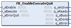 This function block type extends the FB_EnableExecute with the option to acknowledge the error which was detected while executing the task. Refer to FB_EnableExecuteQuit. |