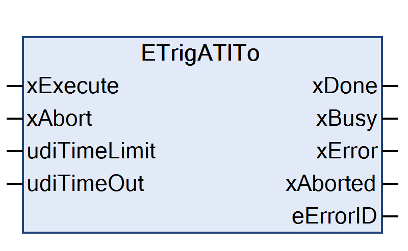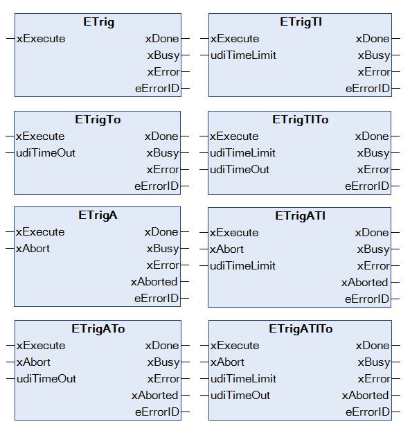 See the detailed descriptions of the reference implementation for the different edge triggered function blocks in the library: ETrig | ETrigTl | ETrigTo | ETrigTlTo | ETrigA | ETrigATl | ETrigATo | ETrigATlTo