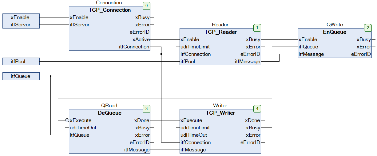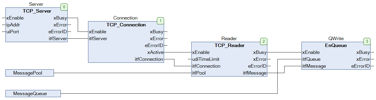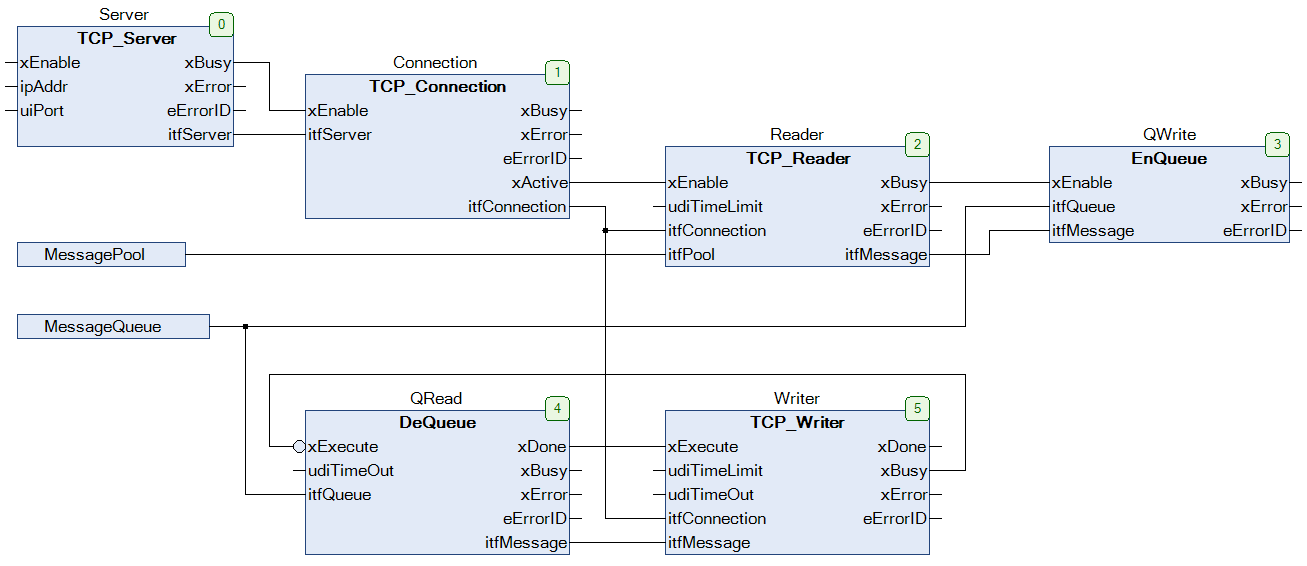 A TCP Server (LConC) listens at a specific endpoint. This endpoint is defined with an tuple consisting of an IP address and a related port number. After a connection to a TCP client has been established, the related Connection (LConC) will be activated. With the help of an Reader (LConTlC), a message structure is allocated out of a MessagePool. This structure is then used to store the information received from the client. For further processing, the message is then handed over to function block QWrite (LCon) that interfaces a queue.