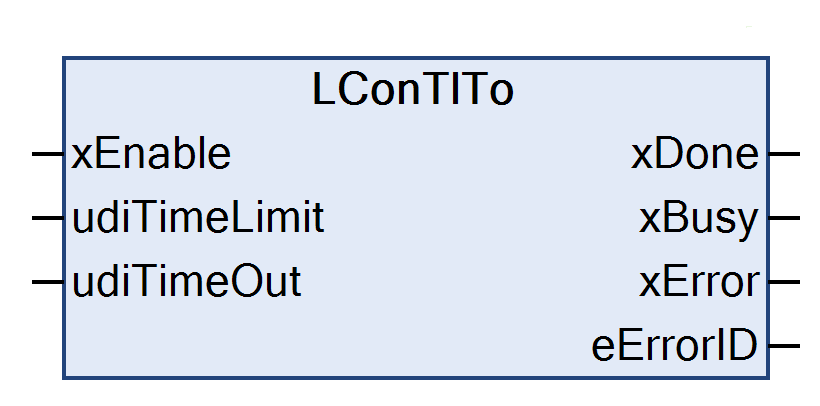 When processing its defined operation, a function block could be forced for example to wait for an external event. It can do this in an internal loop (Busy Wait) or it can check in each invocation whether its task can be completed in full. The udiTimeOut parameter can define then how much time is permitted for consumption for the defined operation. Function blocks with the udiTimeOut input variable are implemented in such a way that the current invocation is exited towards a error condition (xError ⇒ TRUE and eErrorID ⇒ ERROR.TIME_OUT) when the time interval as defined by udiTimeOut has been exceeded.