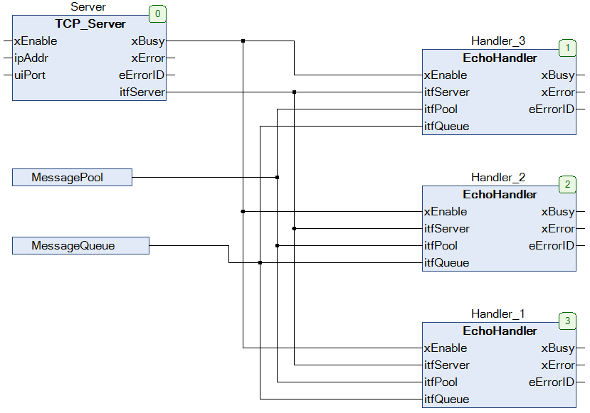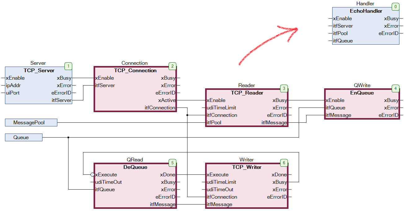 Step 1: Encapsulate the "Reader -- Queue -- Writer" logic into a function block called EchoHandler