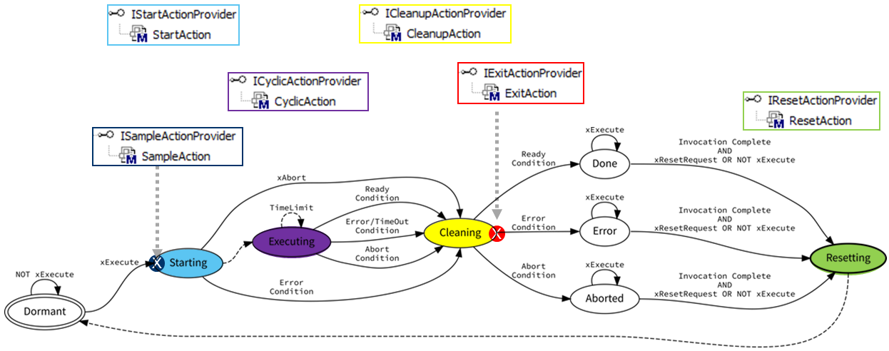 The state of the output variables will be valid for a minimum of one invocation even though the state of the xExecute input variable is already set to FALSE. In this case (reset request is TRUE) the internal state of the function block is automatically reinitialized. In the other case (xExecute is still TRUE) the function block is waiting for a falling edge of the input variable xExecute before reinitializing the function block (standard handshake).