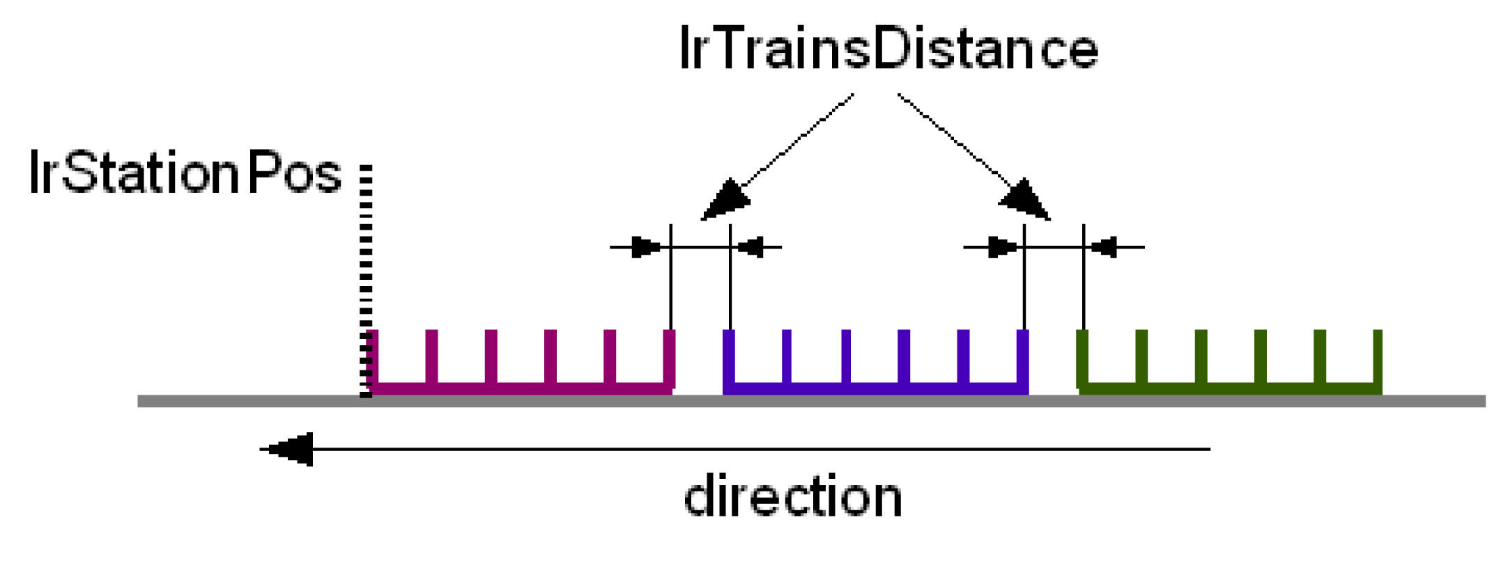The parameter specifies the distance between the trains that all trains receive in the waiting line. Whereas the train closes the gap, the distance is reduced until the train has approached lrTrainsDistance of the train moving in front. The value of lrTrainsDistance must be larger than lrCrashDistance. The parameter can be set separately for each station.