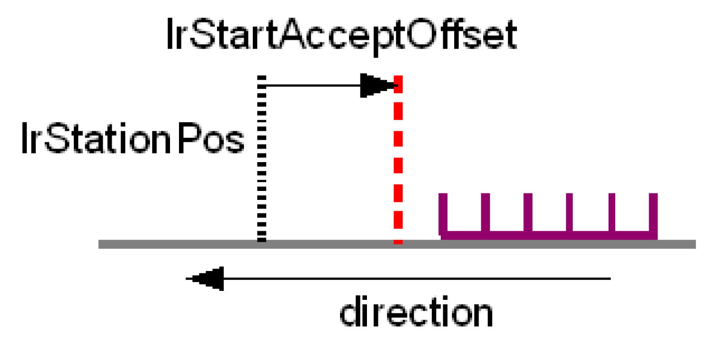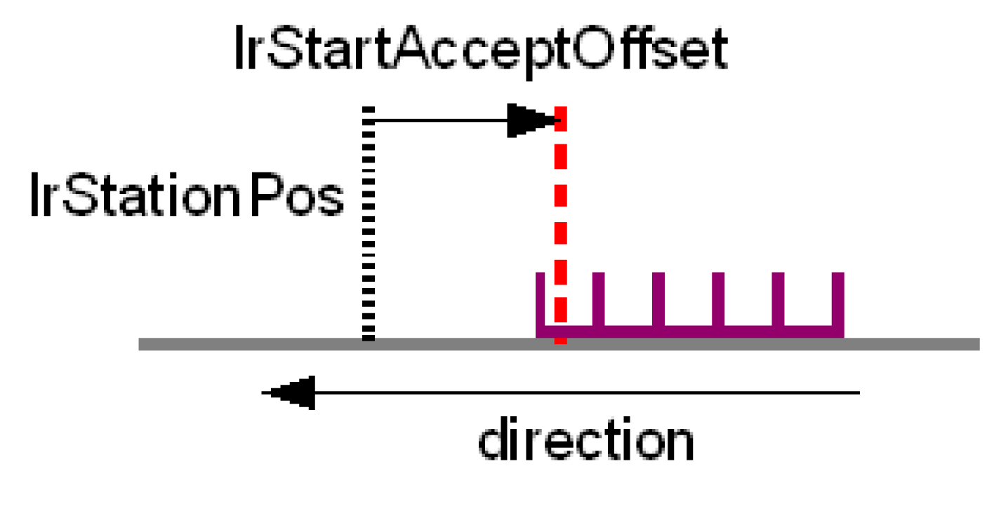 The parameter specifies the Offset from the point where the start signals are accepted from a train. If a train moves into an empty station, the front edge of the train has to be closer to lrStationPos as the specified Offset. The position where the train begins to accept start signals are calculated from lrStationPos + lrStartAcceptOffset. Therefore, this has to be lrStartOffset <= 0.