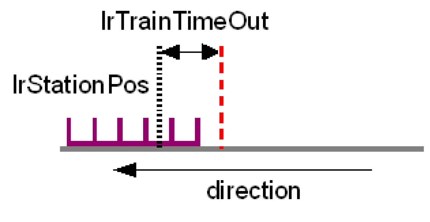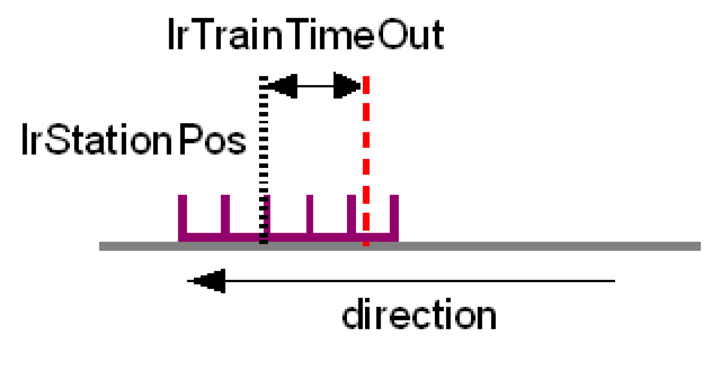 The parameter lrTrainTimeOut specifies the point where the distance of the rear edge of the last train becomes the bit xTrainTimeOut = TRUE in a station. The bit can be used to retrieve a train from the preceding station and to close up behind before the station is empty. This may be necessary when, e.g. the feed belt to the station cannot be stopped and a train should therefore always be positioned ready for loading in the station. The parameter can be used to call a second train into the station within due time before the last train is full and departs from the station.