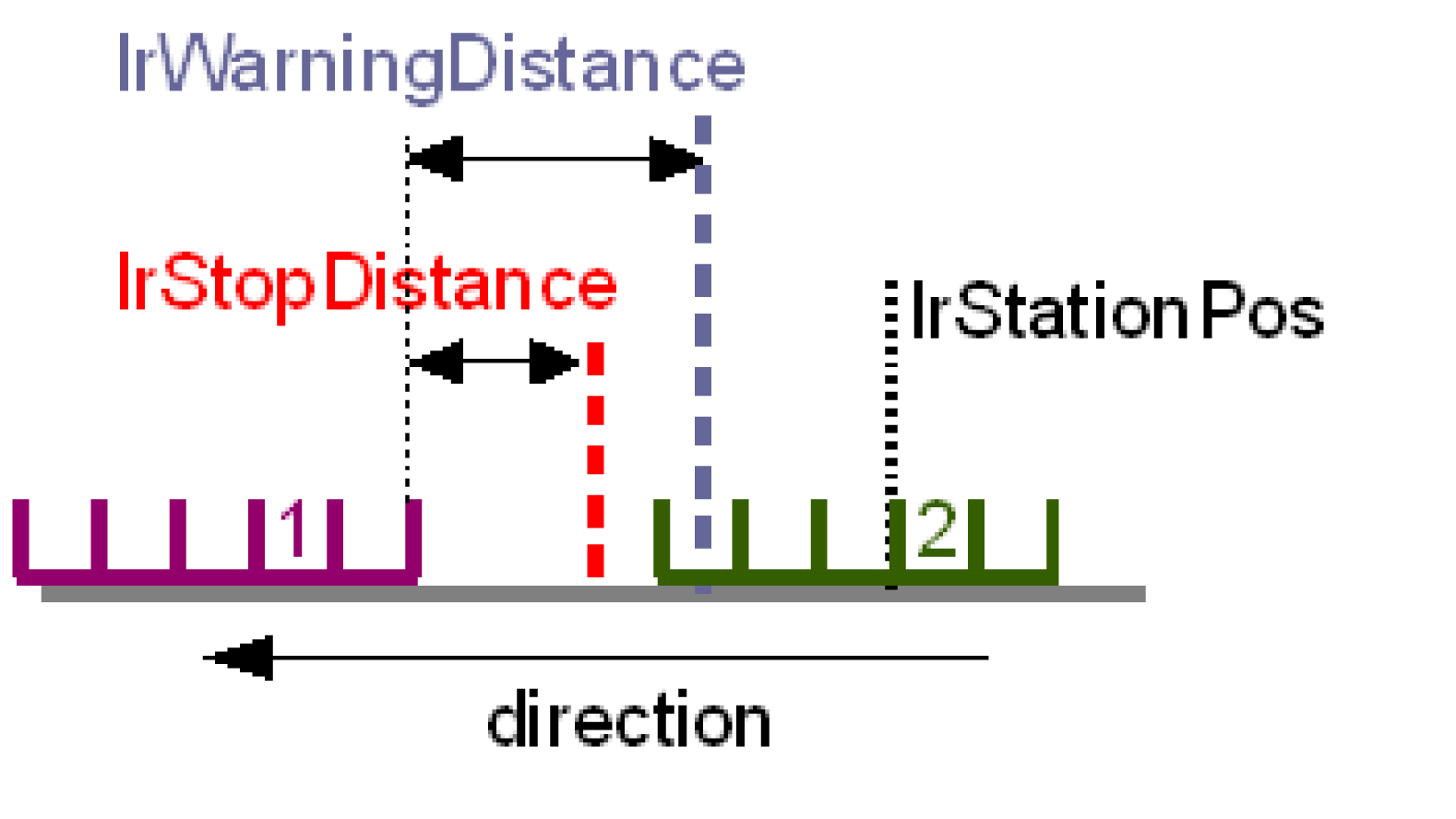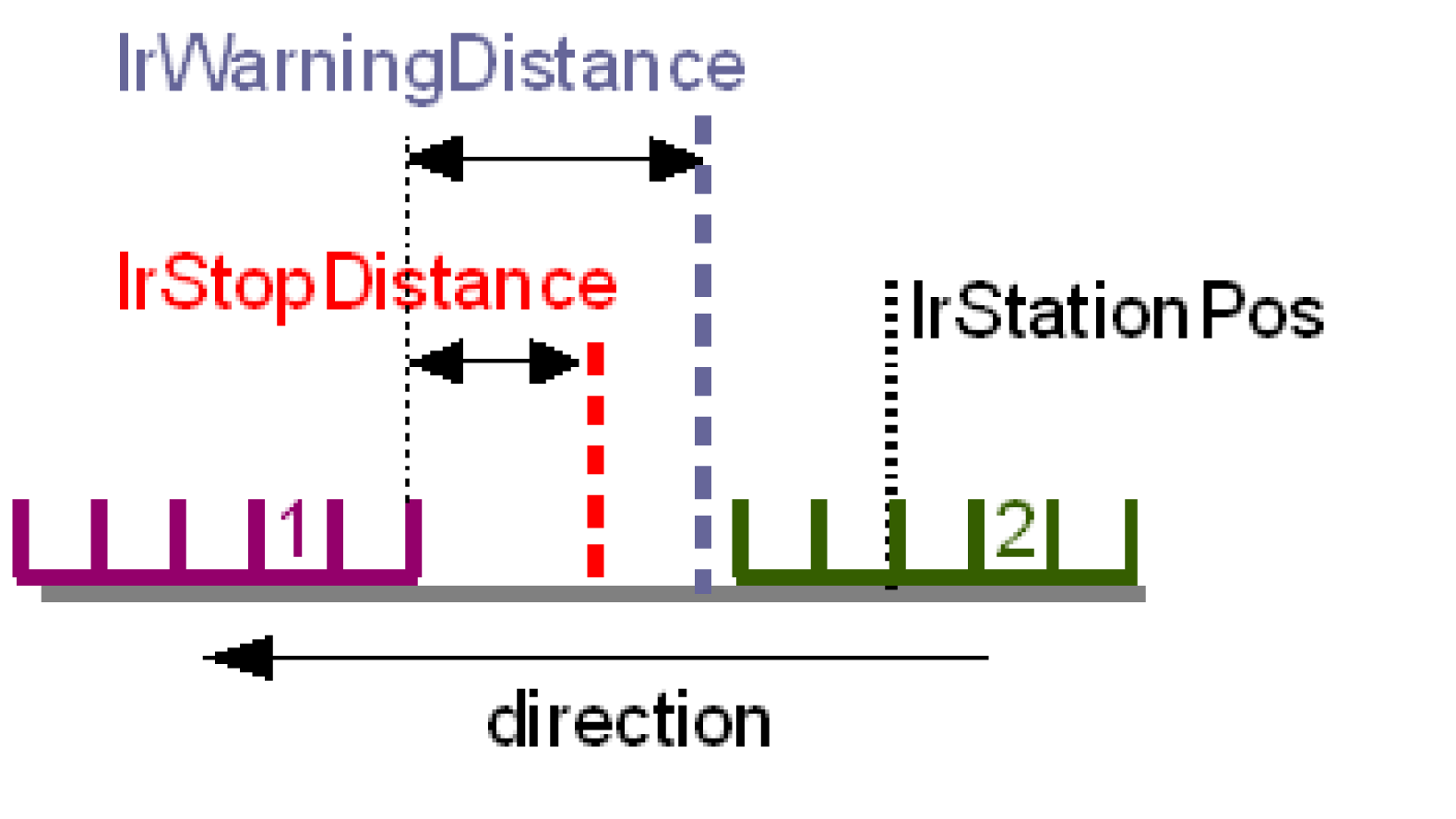 The parameter lrWarningDistance and lrStopDistance are used to control the distance alert functions xWarningDistance and xStopDistance. In the example displayed, train 1 is already in the next station and train 2 is being loaded. If train 2 moves closer to train 1 than lrWarningDistance or lrStopDistance, then xWarningDistance or xStopDistance will be TRUE in the Feedback structure station.