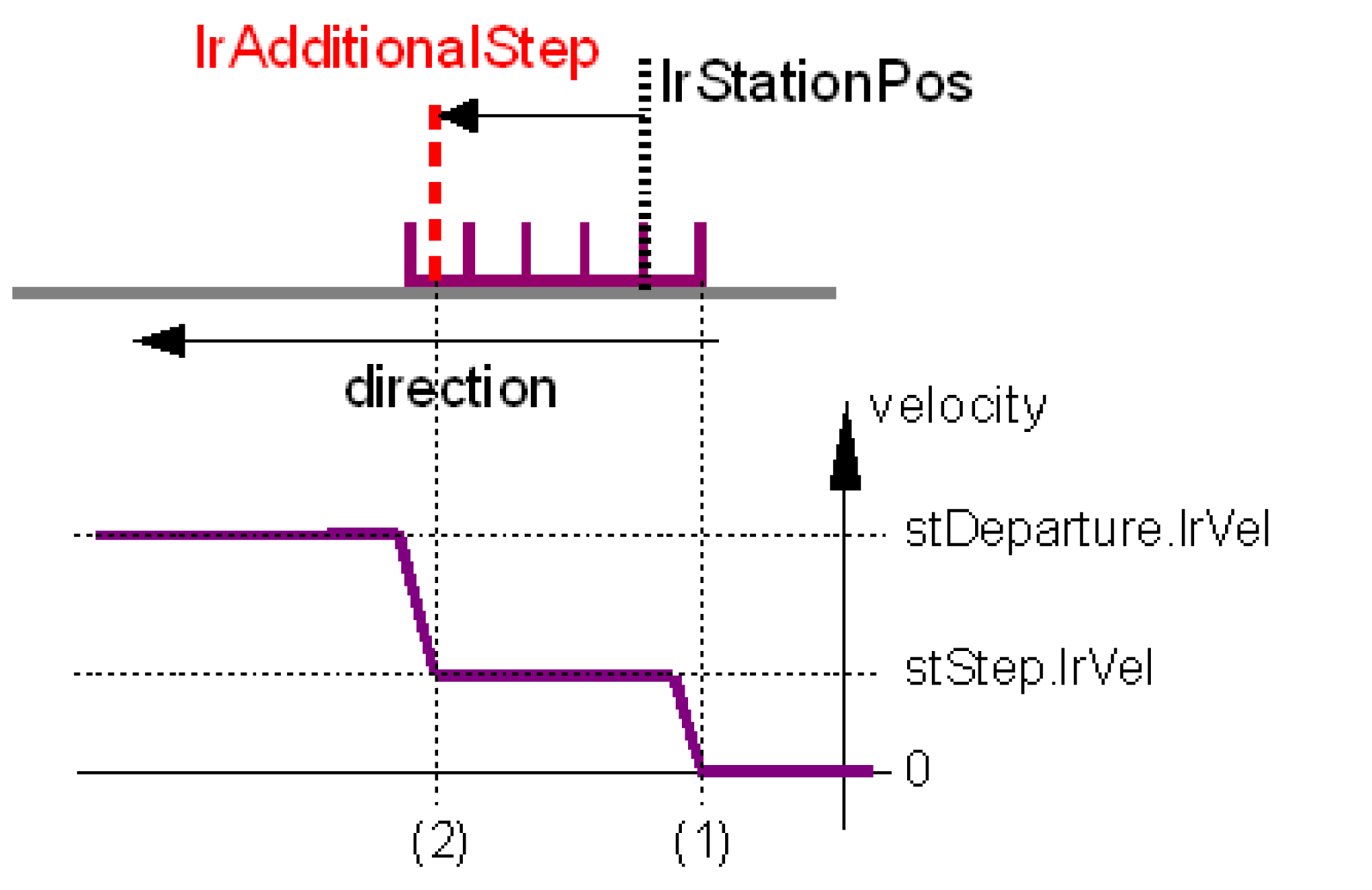 Example for an INDEXED STATION: If lrAdditionalStep > 0 is set, then the train starts after the last start (1) with stStepMove Parameters until the rear edge of the train lrStationPos + lrAdditionalStep is reached (2). Then the train starts with stDepartureMove Parameters to the next station.