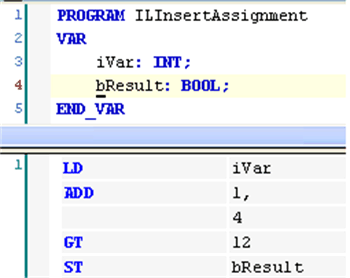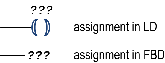 In FBD, the assignment is inserted as a line followed by ???. In LD, it is represented by a coil and ???: