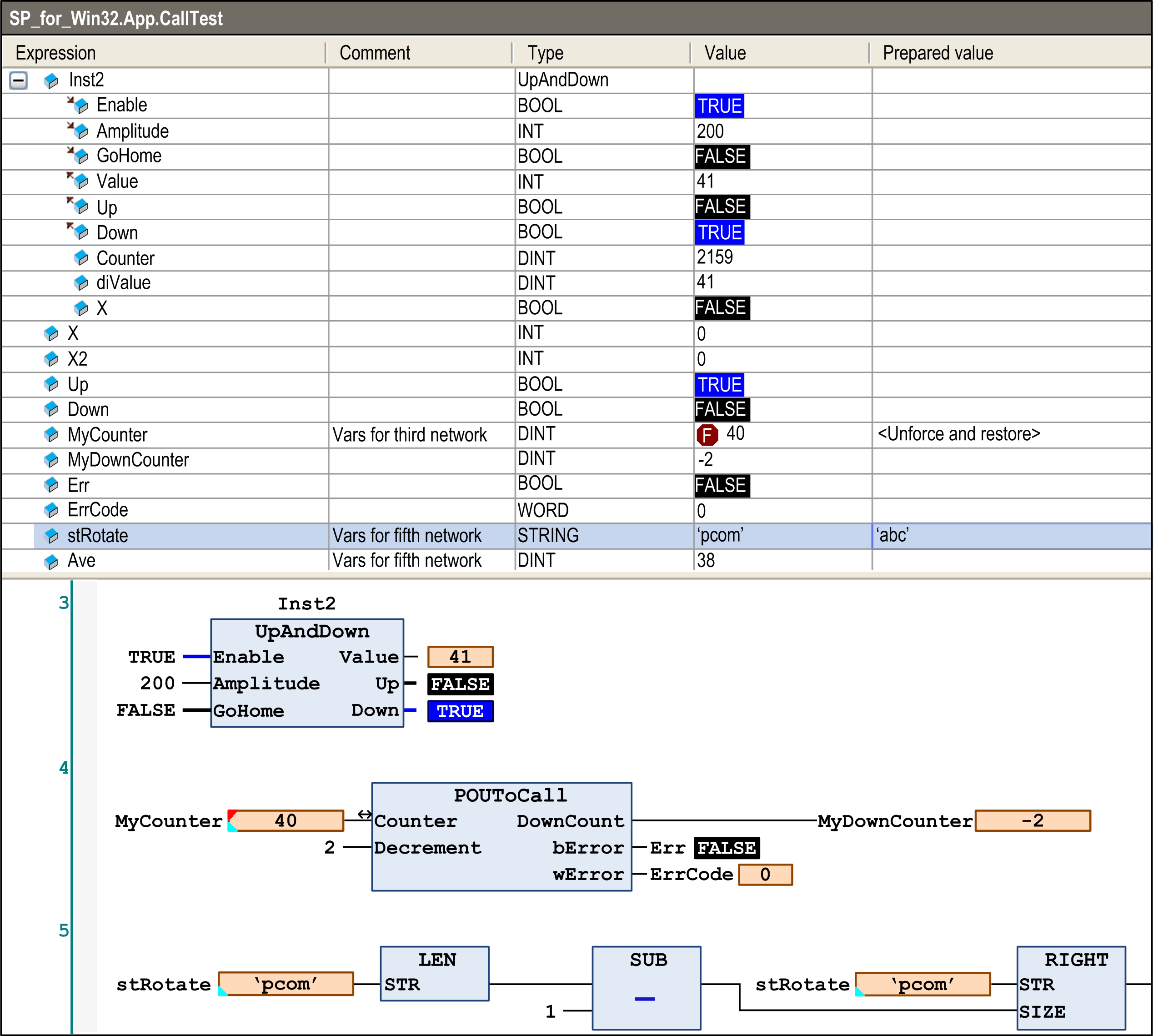 If the inline monitoring is not explicitly deactivated in the dialog box, it will be supplemented in FBD or LD editor by small monitoring windows behind each variable or by an additional monitoring column showing the actual values (inline monitoring). This is even the case for unassigned function block inputs and outputs.